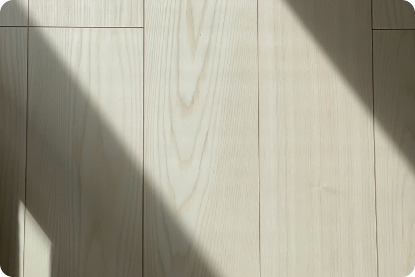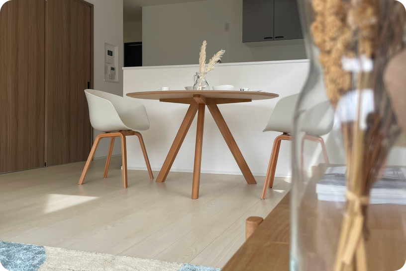 淡いグレイッシュなフロアとホワイトの壁が、室内に差し込む光を優しく増幅させている。主役は、あえて背を低く抑えたソファと、有機的なカーブを描くシェルチェア。家具の「足元」に抜け感を作ることで、限られた面積に奥行きとリズムを生んでいる。無垢材の質感を繋ぎ役にした、計算ずくのナチュラル・モダン。過剰な装飾を排し、余白を愛でる大人のための住まいといえる。